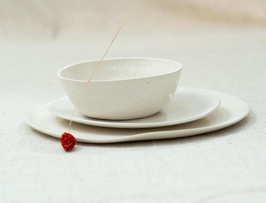 סט לבן בעבודת יד – קערת קרמיקה, צלחת מנה ראשונה וצלחת עיקרית