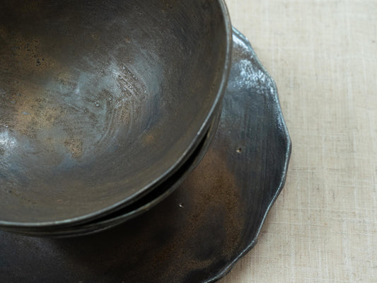 סט קרמיקה כפרי בעבודת יד – שחור עם נגיעות זהב | קערה + צלחת עיקרית