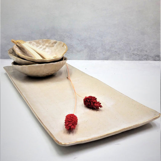 מגש מלבני עם קעריות קטנות בגוון בז' וגימור זהב