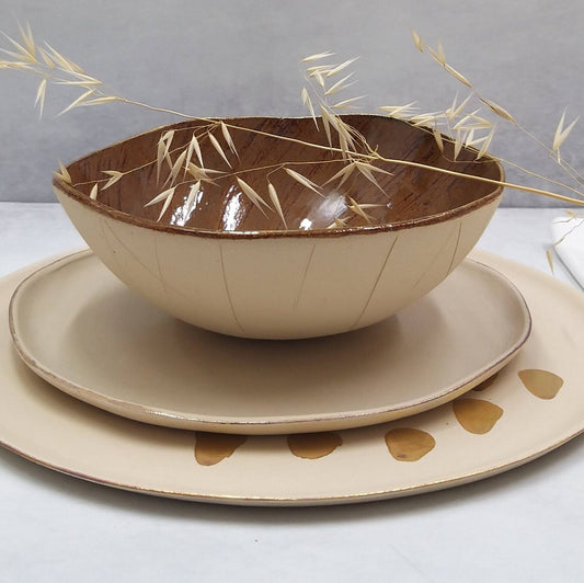 סט כלי אוכל מודרני מקרמיקה בצבעי חום וקרם - צלחות בעבודת יד עם גימור זהב 24 קראט