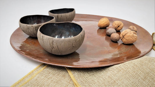 סט הגשה - מגש עגול מקרמיקה וקעריות בגווני חום אדמדם וטורקיז