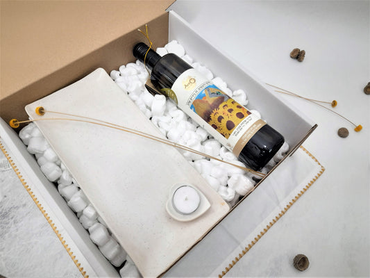 מארז מתנה אקסקלוסיבי כולל שתי קערות הגשה, פחית שמן זית אסי ומחזיק נר לב