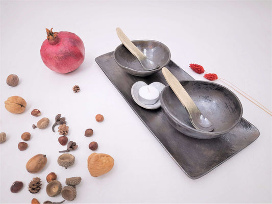 מגש מלבני מקרמיקה עם זוג קערות הגשה קטנות ושתי כפיות חרס