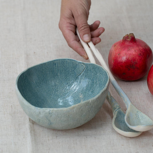קערת קרמיקה תכלת בעבודת יד עם שתי כפות – סט הגשה כפרי לסלטים, מטבלים ונשנושים
